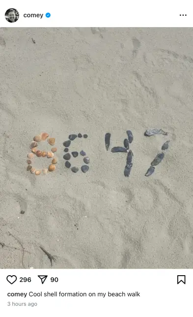 The controversy centers on Comey’s Thursday morning post showing beach shells arranged in shapes resembling “86 47” with the caption: “cool shell formation on my beach walk.” Trump administration figures quickly interpreted this as referencing the 47th president, with “86” allegedly serving as slang for killing.