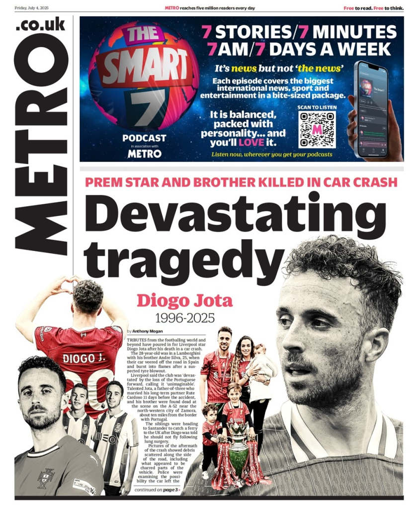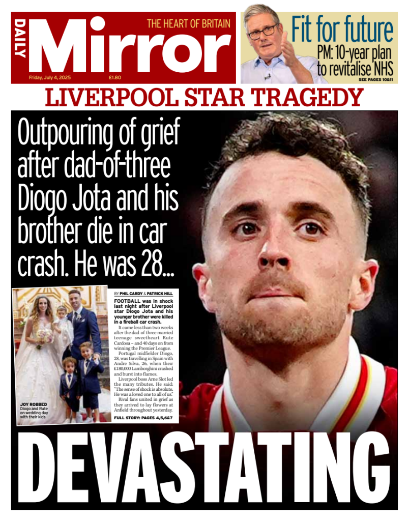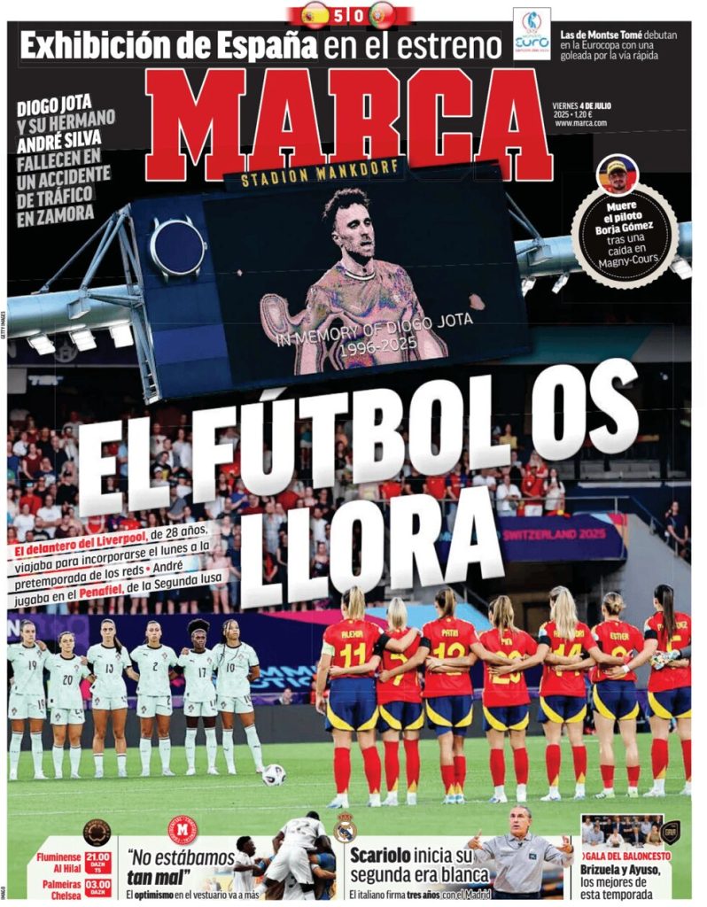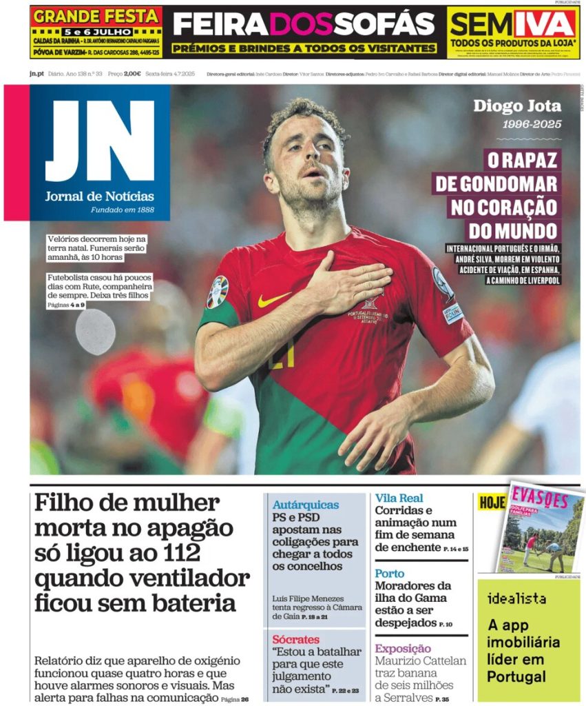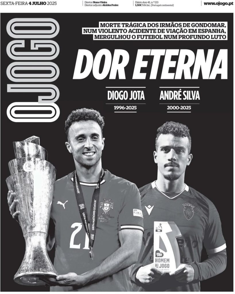 FRONT PAGES: DIOGO JOTA July 4, 2025 Share: How the media covered the passing of Diogo Jota 🔥0 News Now: Diogo Jota crash likely caused by speeding, police say FIFA confirms 2026 World Cup seeding pots Newcastle defeats Everton, secures first away win since April Inter Miami crowned MLS champions as Messi shines in 3–1 win