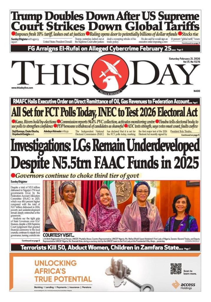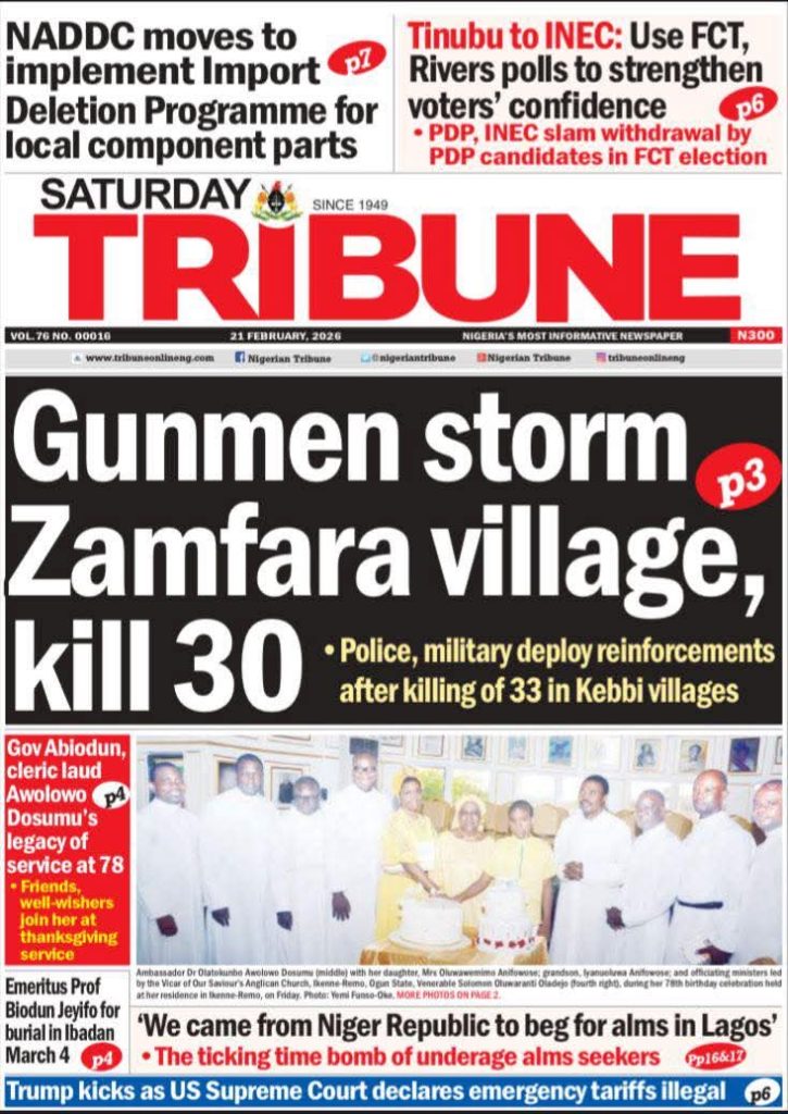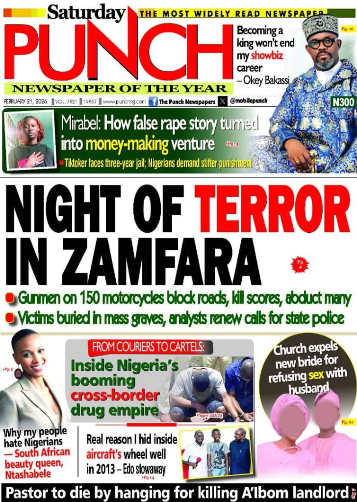 FRONT PAGES: Nigerian Newspapers – 21 February 2026 February 21, 2026 Share: NEWS NOW:55 Ghanaian nationals killed in Russia-Ukraine war: OfficialTinubu welcomes UK-backed Lebara into Nigeria’s telecom marketFCT show-of-force ends in tragedy as operational vehicle crushes female officerNSCDC officer dies after being run over by patrol vehicle during Abuja drill🔥0 💬 Join our WhatsApp Channel 🌐 Join our WhatsApp Community