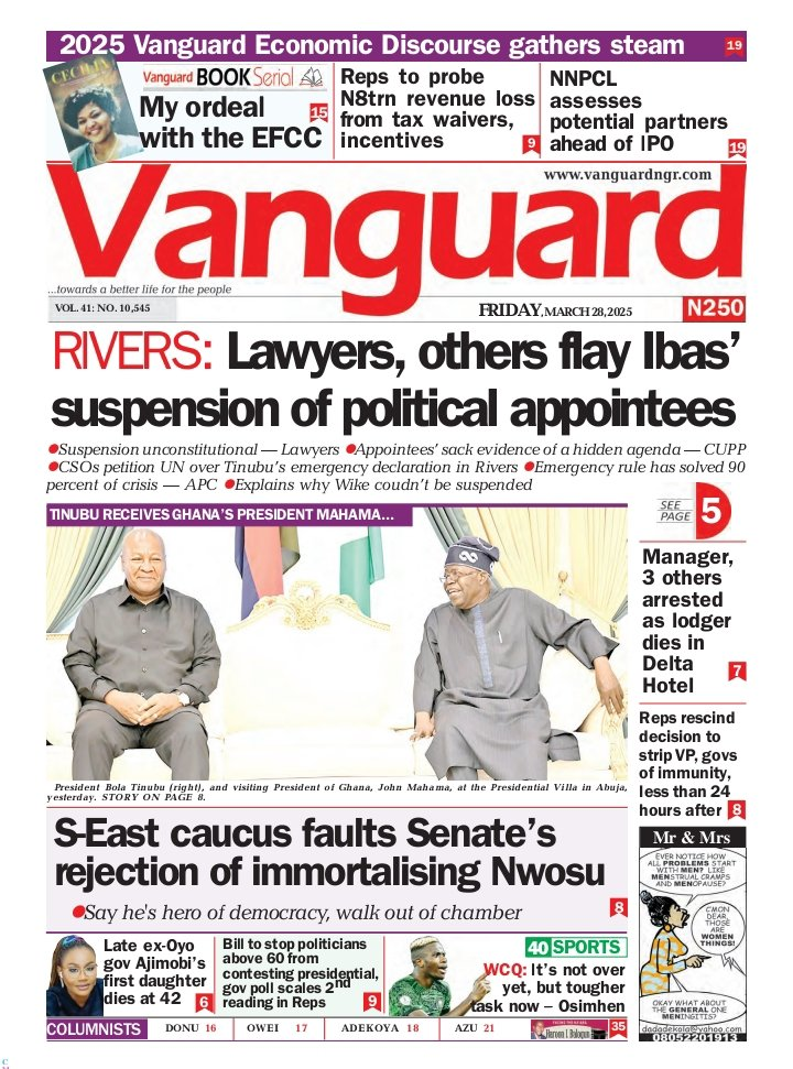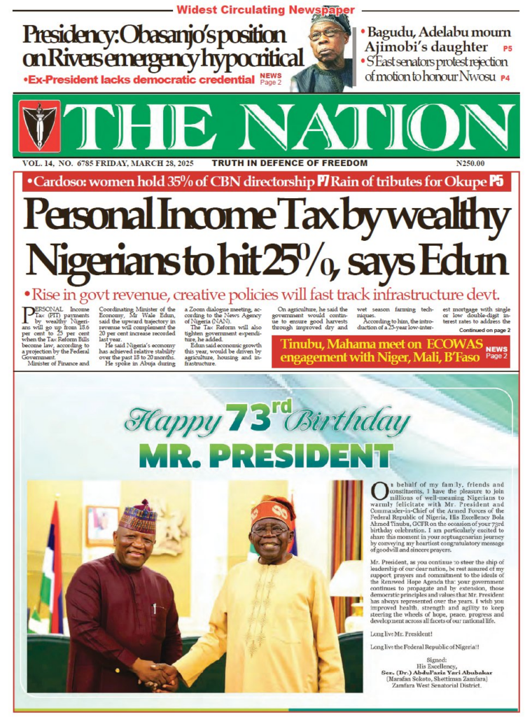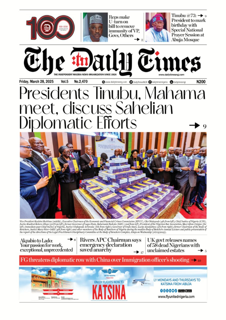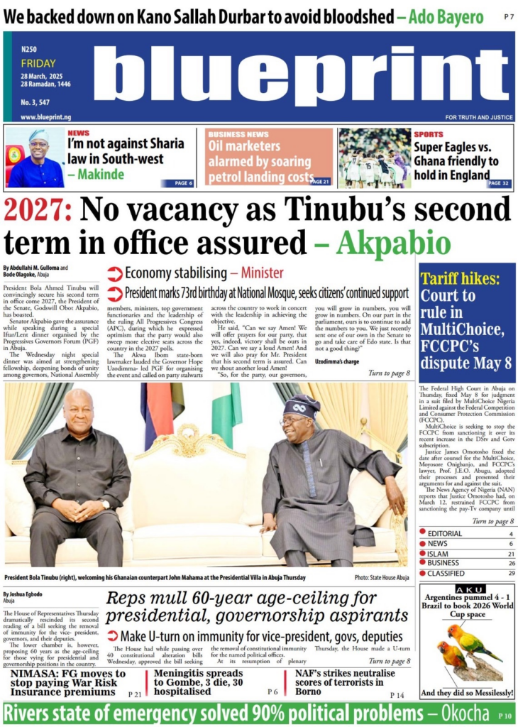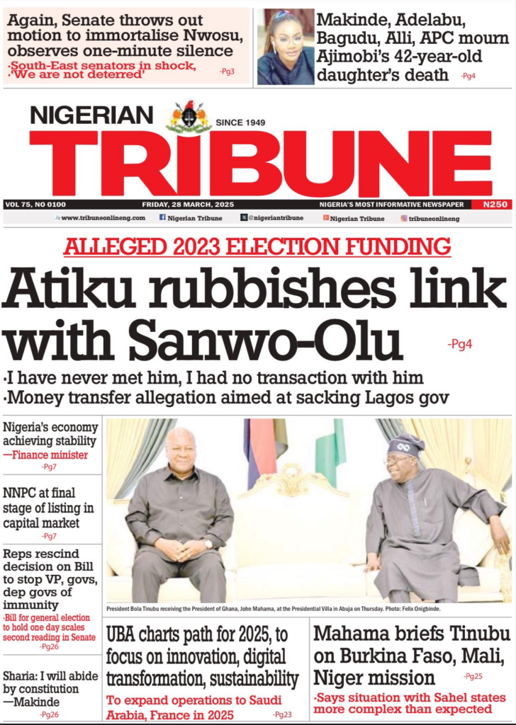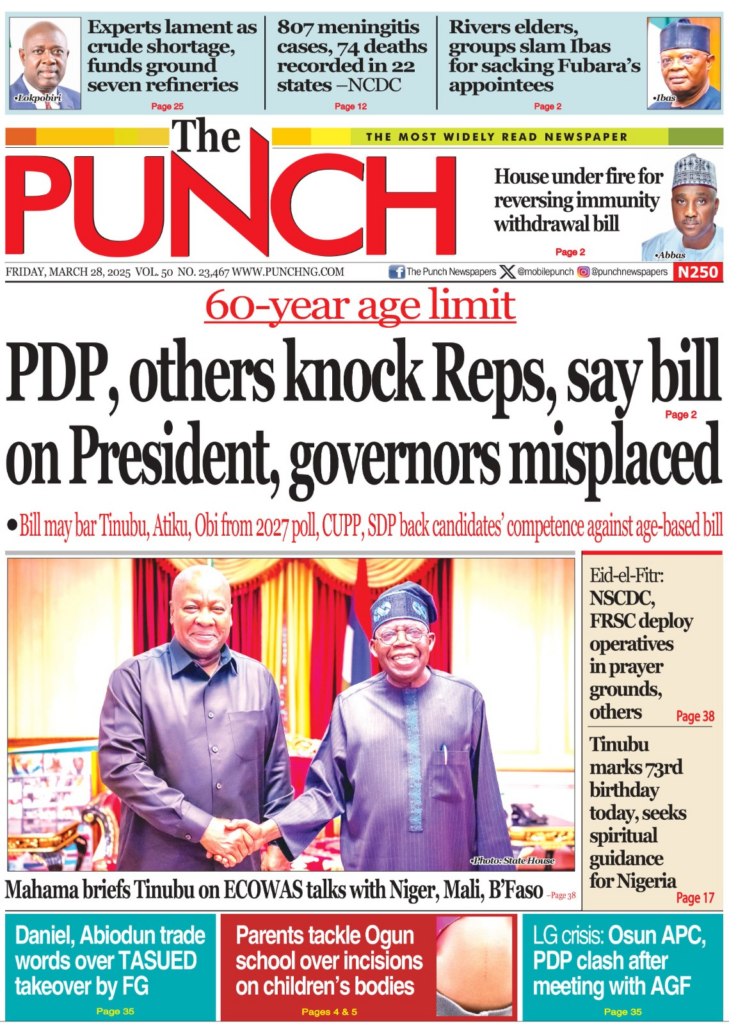 FRONT PAGES: Nigerian Newspapers – 28 MAR 2025 March 28, 2025 Share: 🔥0 News Now: Eddie Howe hospitalized, to miss Newcastle vs Man United showdown Man United captain, Fernandes spotted dining with Al Hilal Star amid mega Saudi offer Alexander Isak set for Liverpool medical after record-breaking £125m deal Liverpool defeat exposes major flaw in Viktor Gyokeres despite Arsenal transfer links