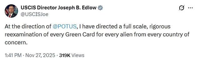 ‘At the direction of @POTUS, I have directed a full scale, rigorous reexamination of every Green Card for every alien from every country of concern,’ Edlow wrote.