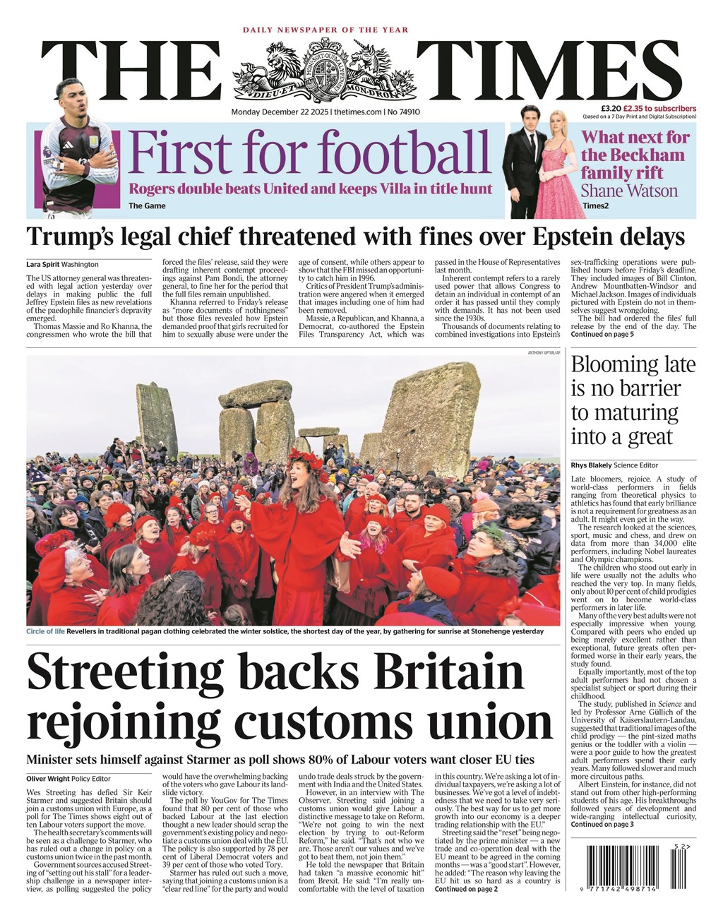The front page of The Times features a story about Wes Streeting defying Sir Keir Starmer by suggesting Britain should join a customs union with Europe, as a poll shows eight out of 10 Labour voters support the move.
