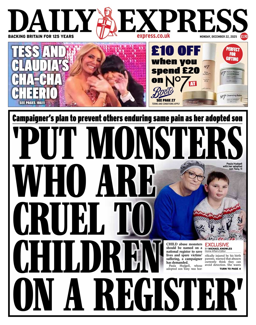 Tony Hudgell’s adoptive mother Paula told the Daily Express that child abusers should be named on a national register to save lives and spare victims’ suffering.