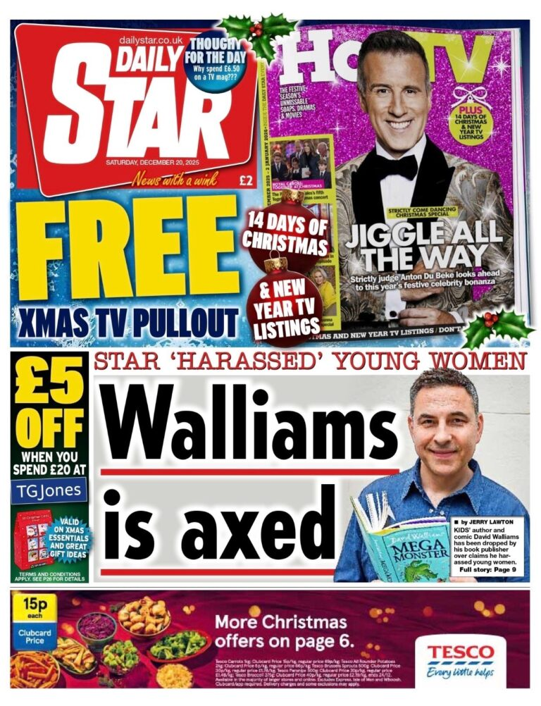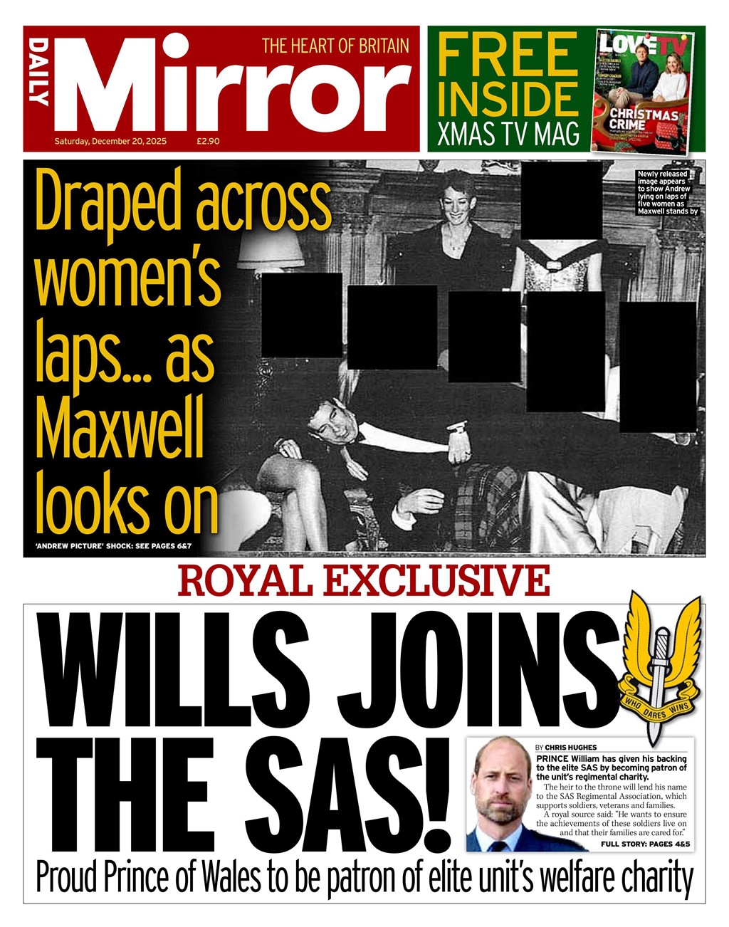 The front page of The Times features a previously-unseen image of Andrew Mountbatten-Windsor lying across the lap of five women as part of a report on the Epstein files released on Friday night.