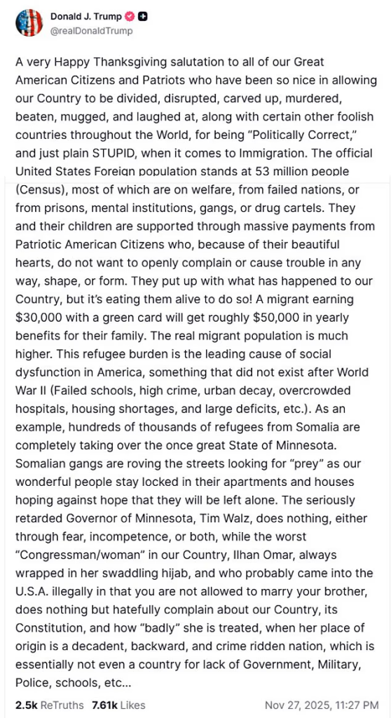 Trump shared a lengthy Truth Social post on Thanksgiving night just hours after revealing one of the National Guard’s shot in the attack had died