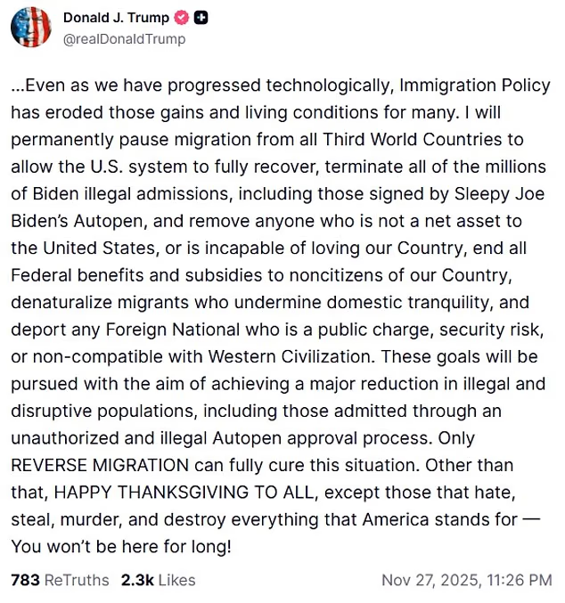 In a lengthy Truth Social post, Trump blamed the Biden administration for the attack and outlined drastic measures, including ending federal benefits for noncitizens and deporting anyone deemed a security risk or “non-compatible with Western Civilization,” stating that “Only REVERSE MIGRATION can fully cure this situation.”