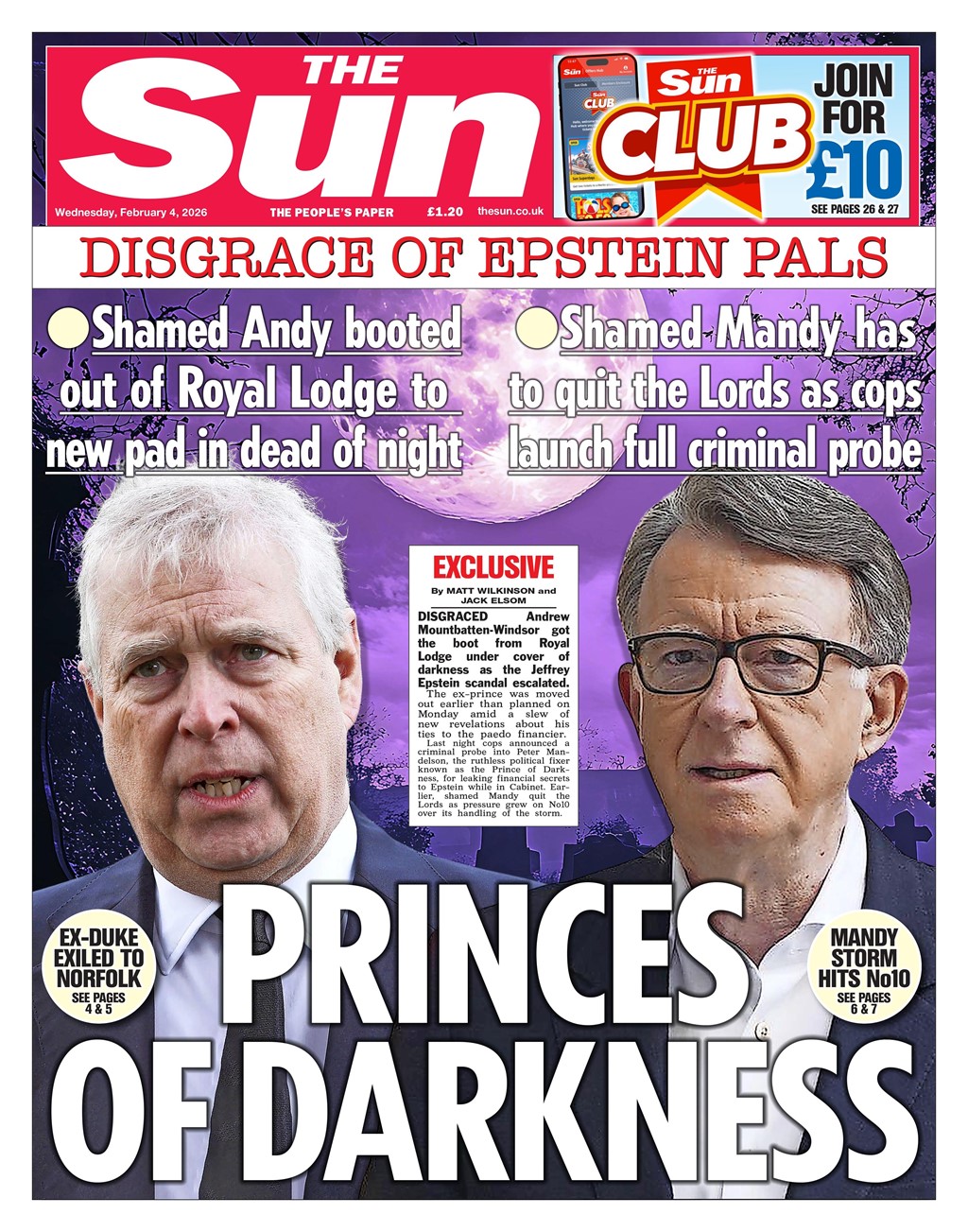 The Daily Mirror leads on Peter Mandelson, who stepped down from the House of Lords amid a criminal probe into allegations he passed sensitive information to Jeffrey Epstein while in office.