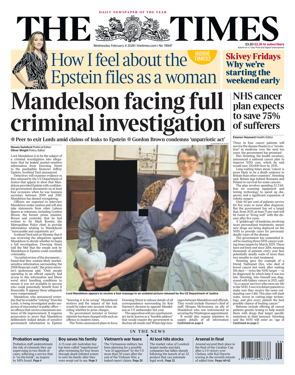 The police investigation into Peter Mandelson over allegations he leaked market-sensitive information from Downing Street to Jeffrey Epstein makes the front page of The Times.