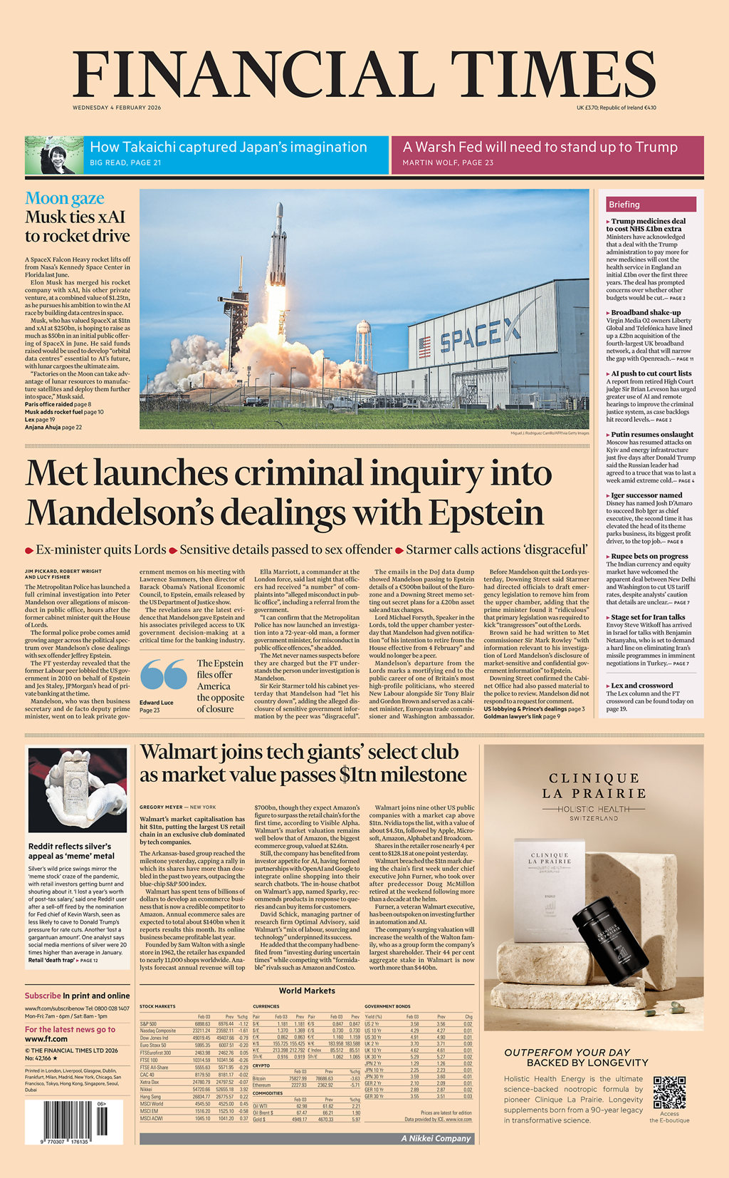 The Metropolitan Police’s criminal investigation into Peter Mandelson over allegations of misconduct while in public office is on the front page of the Financial Times.