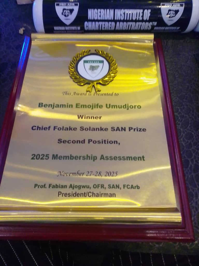 Lawyer Benjamin Umudjoro, Remawa Emilomo, and Abiola Ogundare received top honors at the Nigerian Institute of Chartered Arbitrators’ annual award night in Lagos, celebrating excellence in the arbitration profession.